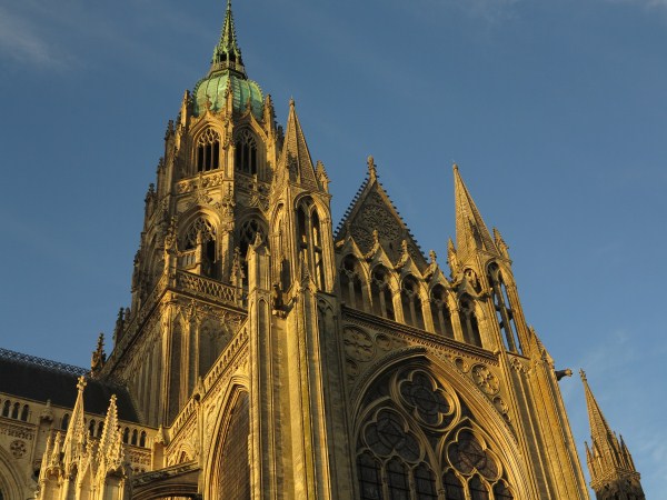 Back at the hub, the cathedral’s Mum-and-Dad towers point as if to say, ‘Asseyez-vous. Mangez… Sit. Eat.’ We comply with a double dessert of flan and tart, café au lait, and feel as if we’ve been filled to bitter-sweetness from Bayeux’s hub to the beaches on the rim.