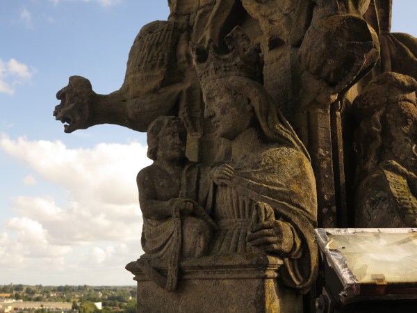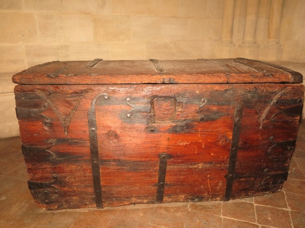 We go up… to the top. ‘Can you climb, m’sieur, m’dame? Are you claustrophobic?’ We coil our way up the dim shaft. Carroted wood timbers (this is a French verb for removing wooden wedges for dating purposes) determine how and in what order the green, uncured oak beams were positioned. Some of it is petrified, 1000-year-old timber.