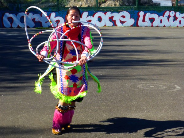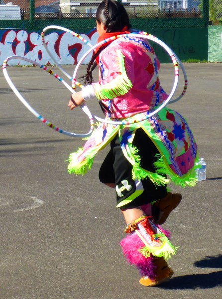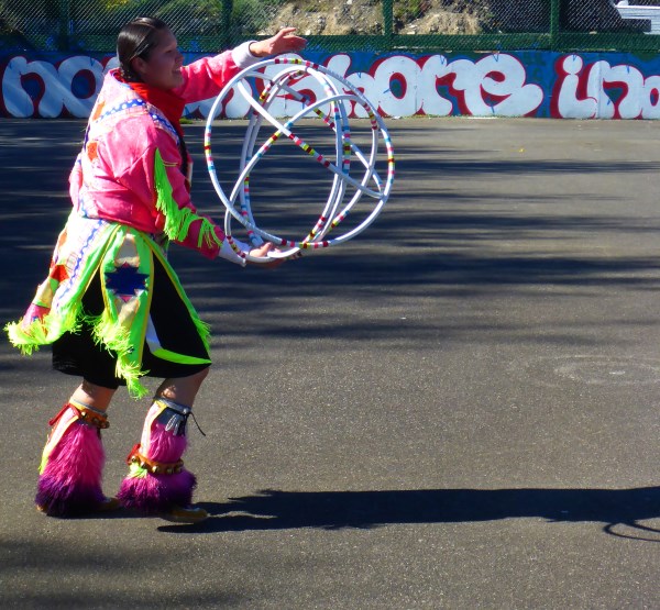 Petie Chalifoux introduces us to her regalia: the pink, red, green and blue of her outfit all signify a family connection. She is a hoop-dancing champion, one of only thirty women in Canada to perform this form of traditional story-telling. She optimizes five hoops (some dancers perform with up to fifty hoops).