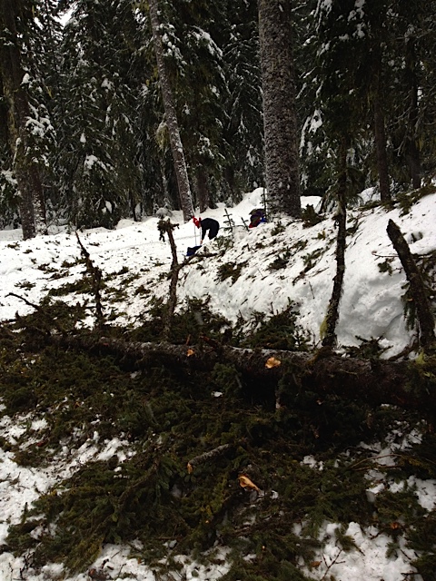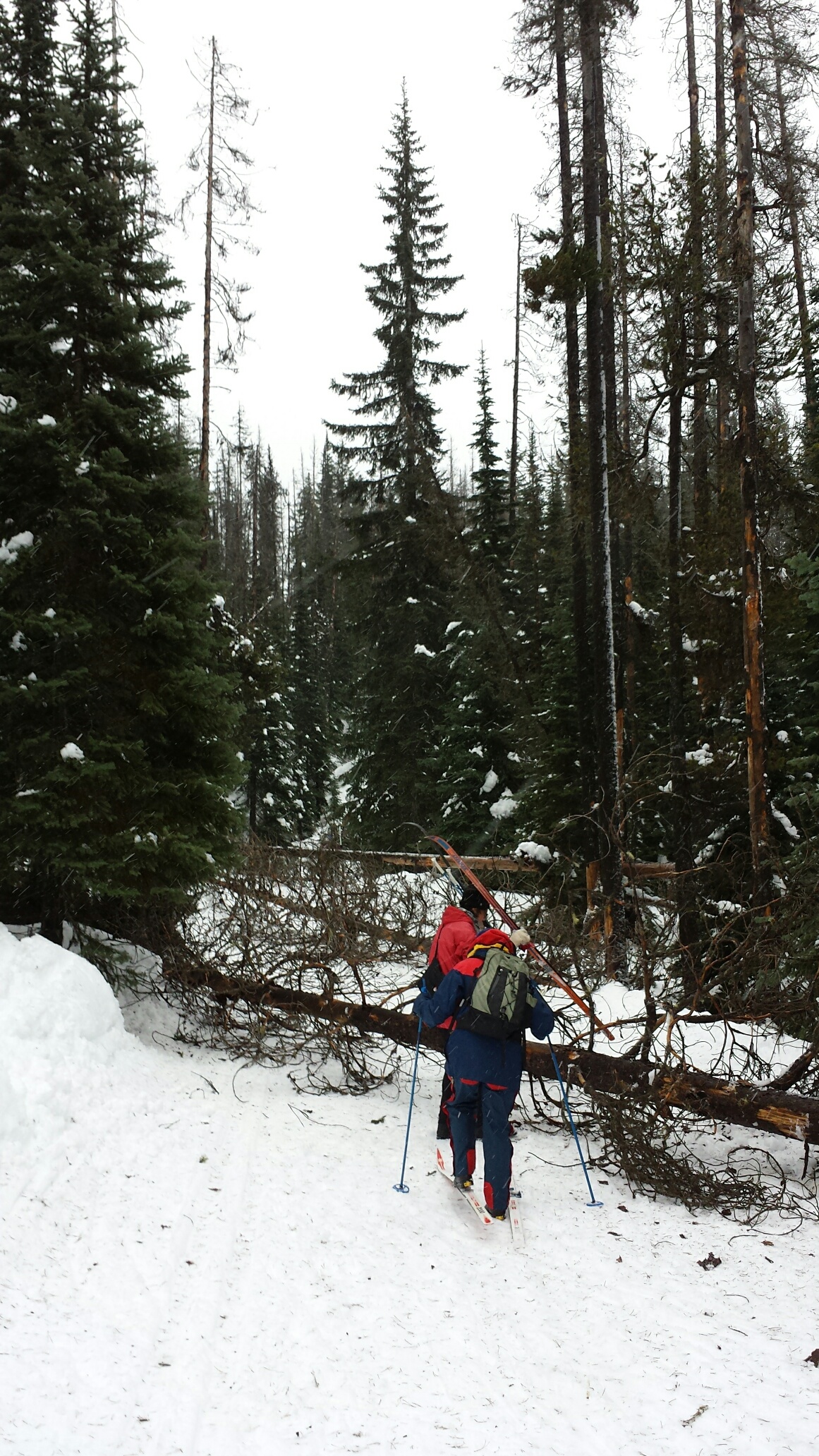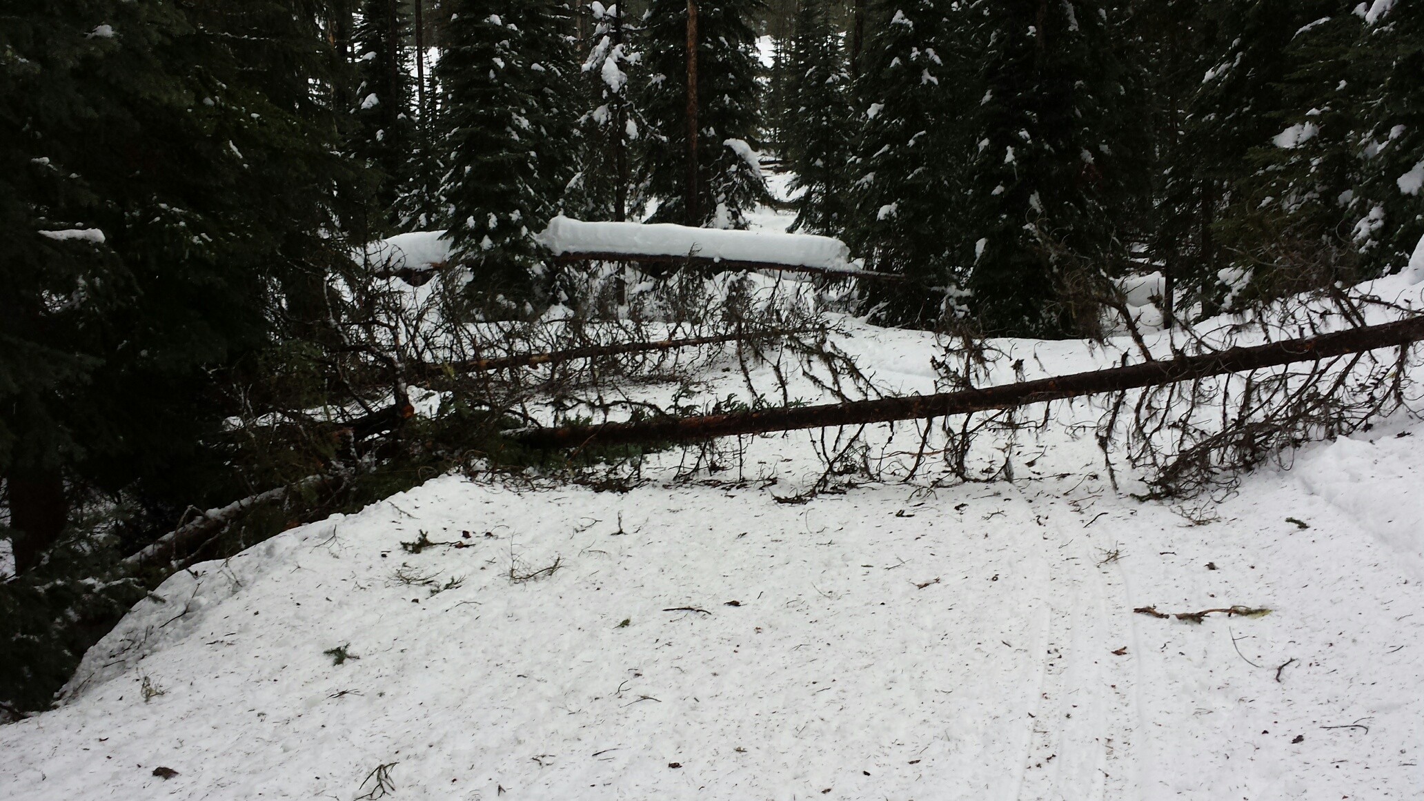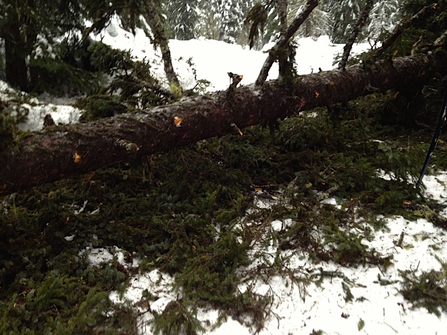 Around the same time, we came upon three skiers gathered round a fallen tree across the trail. Debris littered the trail for ten meters beyond point of impact. What an explosion it must have been.