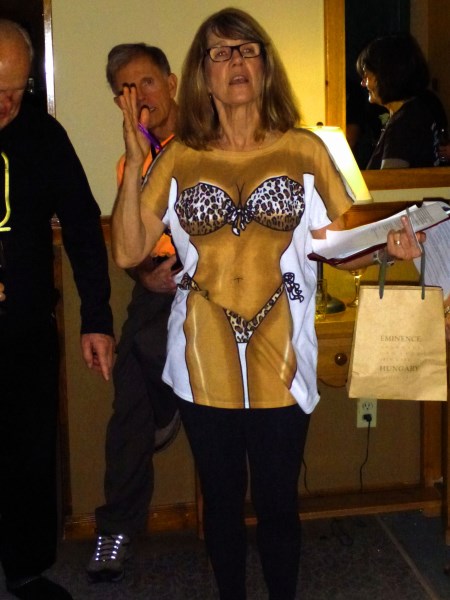Back at the ranch, err, back to the Sundance corral, err, we had a dry-tee-shirt contest to contest, with PhD judges, Mo Iqbal and Diane Fast, tying down skiers who could earn their spurs by telling-all by the shirt they don. The event and trip hostess, Vicki Ulibarri steered, err stirred, shirt-riveting attention from fore and aft. In her words, ‘It’s a shirt that transforms the wearer.’