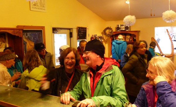 From arrival to departure at Stake Lake, our trip leader, Anna Bentley, tells us we’ve got four hours to play. Blue skies, +4 degrees, tracks well set, packed and tracked — firm without iciness. Friendly Stake Lakers are readying for some British Columbia Cup Races the next day, yet it’s serene on the trails. There are Aspen groves, animal tracks in the snow, and rolling ranch land in the distance. Pines scent the stillness. Some pack lunch in to the upper hut; others are happy to unpack brown bags at the club cabin.